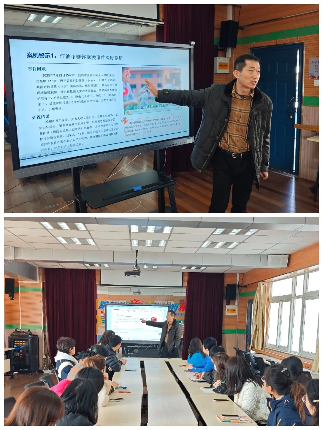 杜金雷副校長結合校園實際工作案例,細致講解教職工在日常教育教學中如何落實安全責任、及時發現并干預欺凌行為、守護學生身心健康,讓全體教職工深刻認識到校園安全與防欺凌工作的重要性與緊迫性。